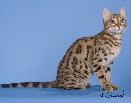 Khaleesi has an exquisite coat pattern with large rosettes. She is substantial and muscular with eyes set low in her head. She has a straight profile, strong chin, and spotted legs. Khaleesi’s only show came on the day she turned eight months old. She competed with eight males, including champions and grand champions, earning her honorable mention by an international judge as the second best Bengal behind the number one Bengal in country at the time.