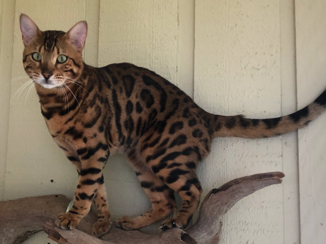 Leo’s show career was short but impressive. At only eight months old, on the first day of his first adult show, he beat champions and grand champions to come in second to the number one Bengal in the country at the time in two out of four rings. The second time Leo was entered he received a Best Short Hair Cat Award, not only beating other Bengals, but all other short hair cat breeds as well. Leo comes from our cattery and is a true winner in every sense of the word.